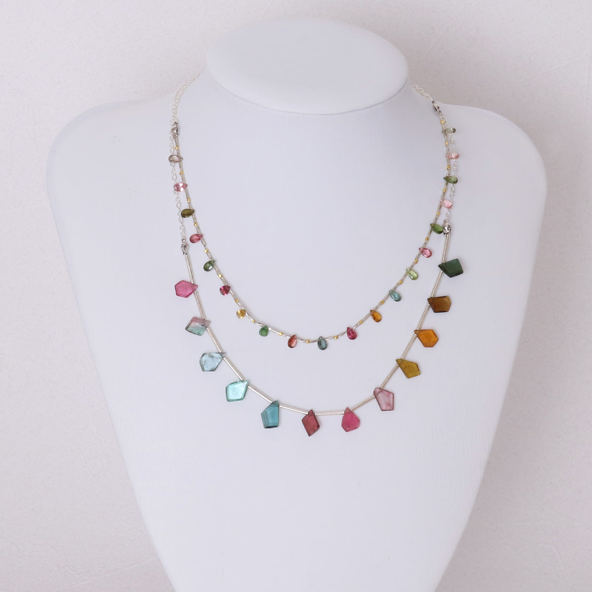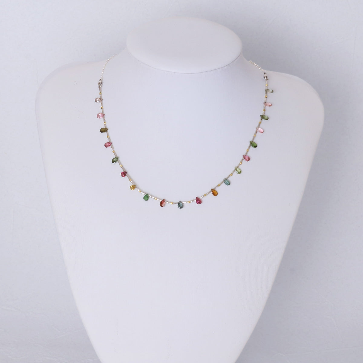 透明度、発色ともに素晴らしい、アフリカ産マルチカラートルマリンのペアシェイプファセットカットを贅沢に20粒使用した特別なネックレス。トルマリンらしい美しい多色のグラデーションが首元を華やかに彩り、間に配したカレンシルバーが上品なアクセントを添えます。